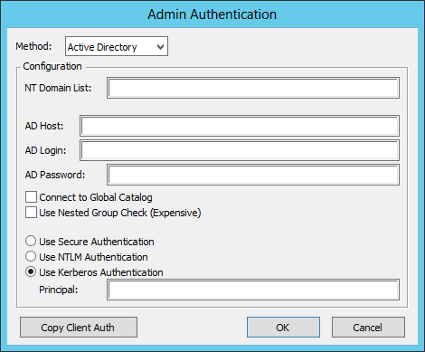 If you choose this option, no additional configuration is needed, and you do not need to read further in this document. However, you still need to set up the Active Directory authentication module as described in Authentication methods (you can also follow the instructions in this document so it is easier to switch to the Kerberos option in the future). You will also need to configure at least one role, as described in the Admin Authentication documentation.