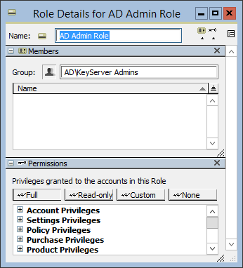 Next run KeyConfigure and logon as Administrator. Open “Admin Access” from the Window menu, then right-click in the window and select “New Role”. Give this new role a name (you can use any name that makes sense to you, as long as it is not already the name of an existing role). In the Group field enter the name of the AD group you created, and in the Permissions panel click “Full”.