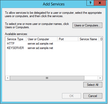 Click OK, then back in the “Add Services” dialog you should see the HTTP and KEYSERVER services listed for your KeyServer host. Click “Select All”, then OK.