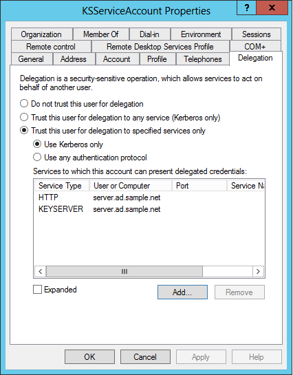 Note that any user account that will be used with KeyServer must be delegatable. Accounts are delegatable by default, but to be sure, you can verify that the “Account is sensitive and cannot be delegated” box in the account's Properties window is not checked.