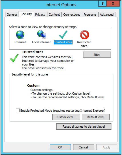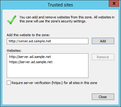 Then click the Sites button to bring up the list of defined trusted sites, and add the URL of your server (you should add both the http:// form and the https:// form of the URL):