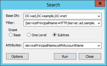 ***Searching... ldap_search_s(ld, "DC=ad,DC=sample,DC=net", 2, "(servicePrincipalName=HTTP/server.ad.sample.net)", attrList, 0, &msg) Getting 0 entries: -----------