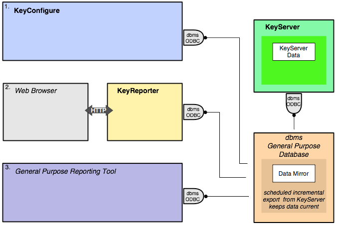 Although the diagrams above illustrate all three reporting tools pointed to either internal or mirrored data, nothing prevents the use of internal data for some purposes and mirrored data for others. Also note that KeyServer includes a handful of "export modules" that are designed to mirror data to a few specific database servers without going through ODBC. But for report generation using KeyConfigure or KeyReporter to query mirrored data, ODBC is the only route. Typically, the connection method for a general purpose reporting tool will likewise be through ODBC unless the tool is actually a integral component of the dbms.