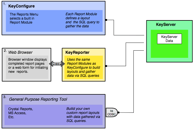 1. In the simplest case, a report is selected from the Reports Menu in KeyConfigure and then the underlying report module uses SQL queries to fetch data from the remote KeyServer using its native protocol.