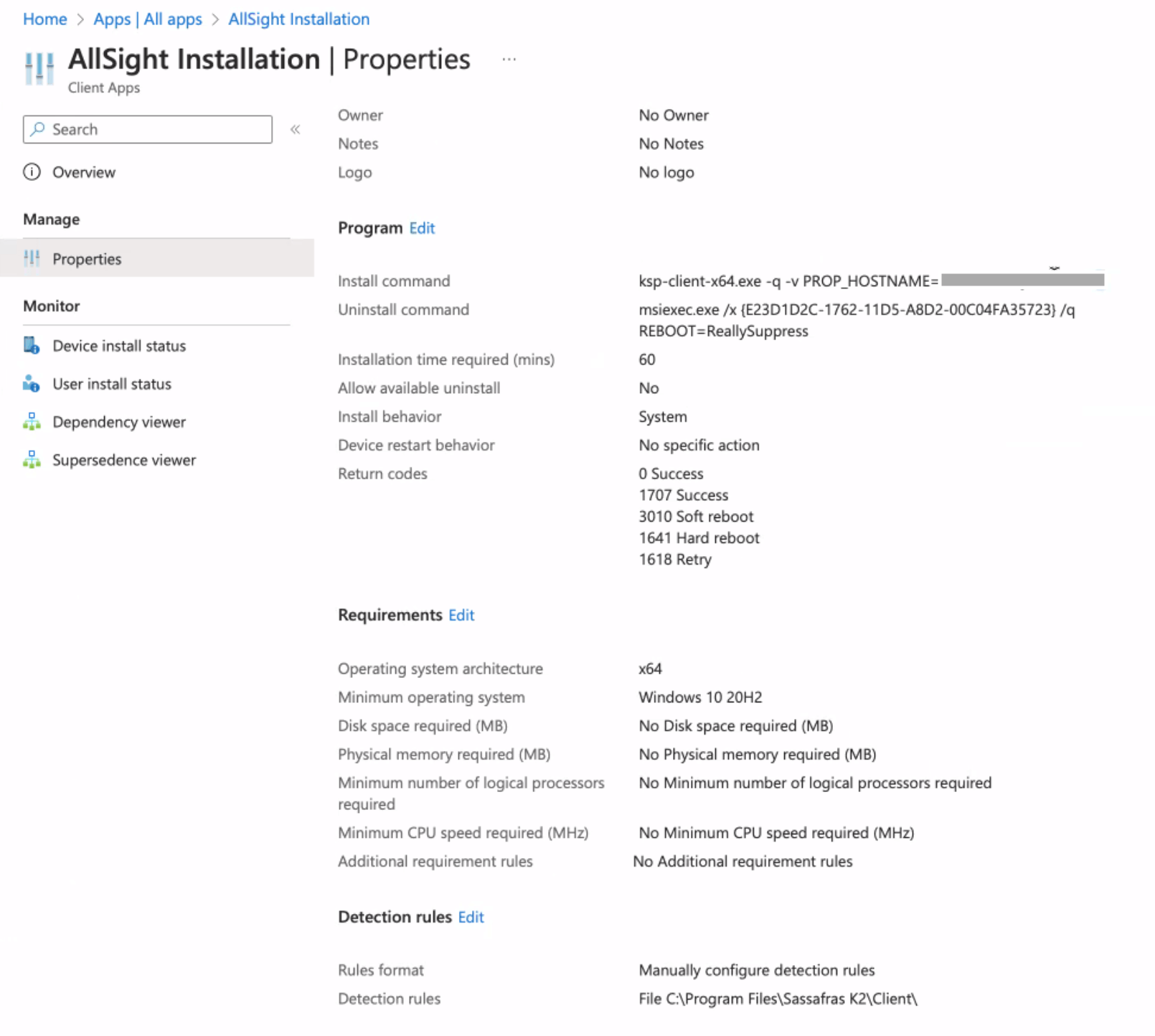 It's also probably a good idea to set a Detection Rule. You can simply set this to detect if keyacc32.exe is in the default installation path of c:\Program Files\Sassafras K2\Client. This works well if you simply want to ensure KeyAccess is installed of whatever version you have in the InTune action, and incremental updates are being served out by our auto update feature. If you want to get more specific with version checking, you can leverage the version string in the Registry at HKEY_LOCAL_MACHINE\SYSTEM\CurrentControlSet\Services\KeyAccess\Settings.