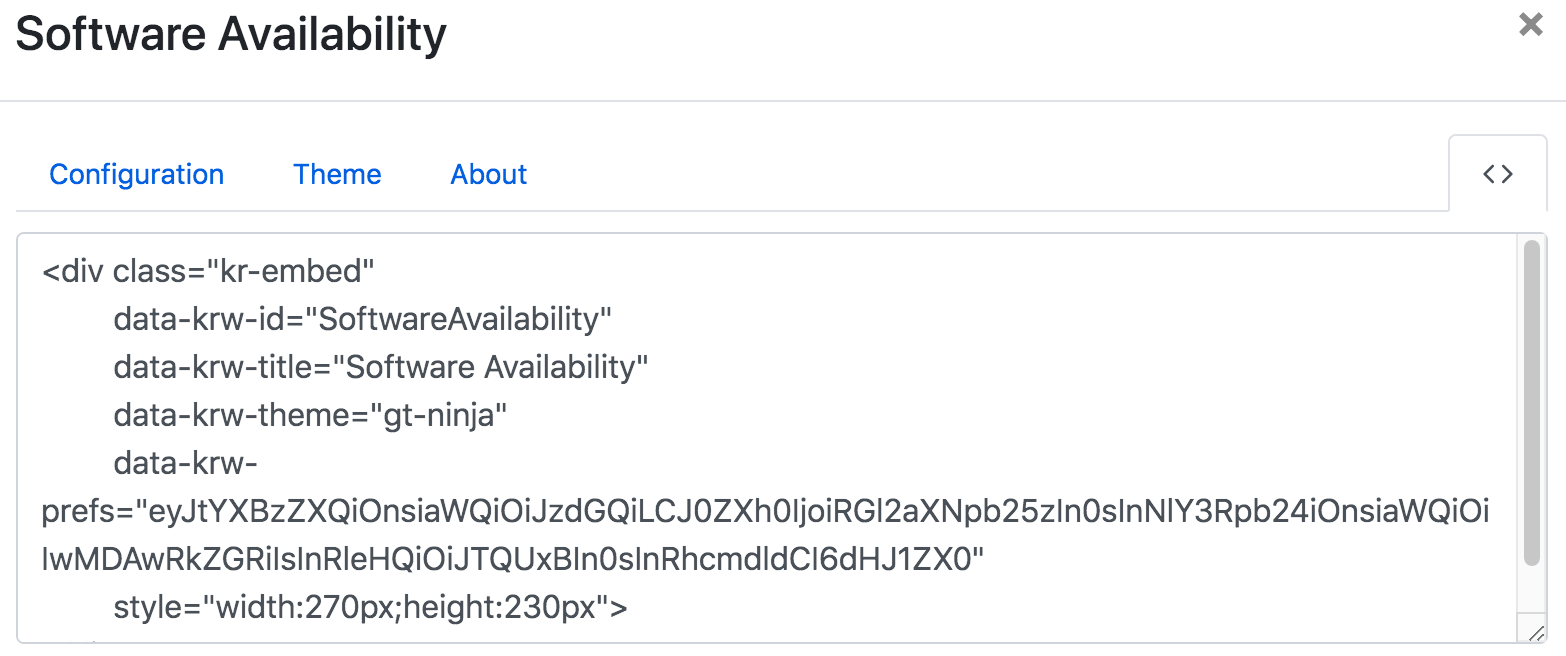 The example also has two optional attributes: data-krw-title for the widget title, and data-krw-theme for the widget theme. The title is used in case the widget is not available from KeyReporter, and otherwise is ignored. The theme is used to change the colors of the widget, as can be done on the main Dashboard.
