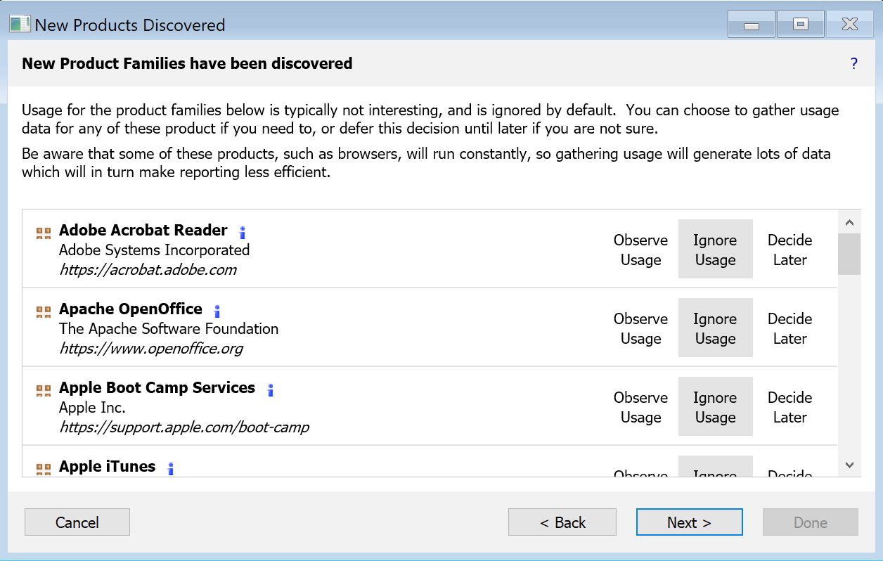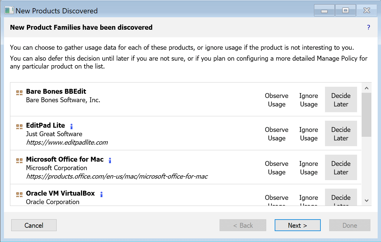 The first window that appears is for what we classify as interesting Products that you likely want to track. The option will default to Decide Later to ensure you do not miss out on anything. It is likely you'll want to choose Observe Usage for all of these, but there may be some you actually don't care about and set to Ignore Usage. Any you choose to Observe will automatically create Observe Policies using the Family Products. This means they are "future proof" as the Family will be updated by our PRS system when new versions come out. You won't need to perform any maintenance in the configuration to ensure you're tracking new software because we're taking care of it automatically.