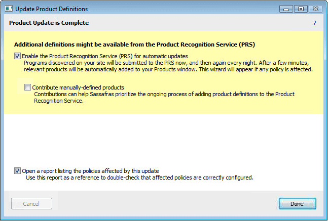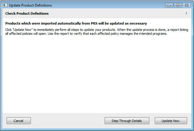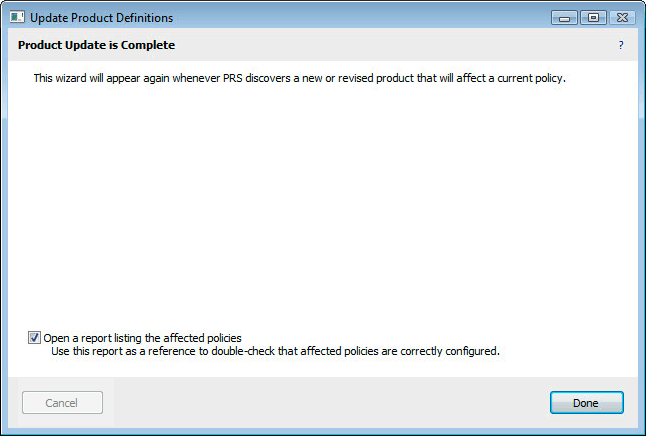In certain cases you may arrive at this wizard when PRS is not yet enabled. In this case you will see a screen like the one above, where you can enable PRS. When PRS is turned on, it will immediately send some data to the PRS server in order to receive any new product definitions that are relevant to your site. This initial communication, and download of new definitions, should complete within a few minutes. It is possible that importing these Product definitions will have an affect on a Policy, so you may see the wizard reappear shortly.