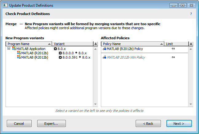 The list of Program Variants on the left shows the variants which are needed for some automatic products. If you click the expansion icon next to one of these variants, you will see the currently configured variants which will be merged to form the new variant. In the screenshot above, MATLAB has been configured for some reason to fully distinguish each version - so 8.0.0.0 is configured distinctly from 8.0.0.591. However, the MATLAB product containing these versions is sold as a single product covering any minor versions in the 8.0.x variant. So these two specific versions should always be treated in the same way since they are licensed in the same way. Because the variants are currently distinguished all the way to the last decimal, it's possible that the "MATLAB 2012b Win Policy" only manages version 8.0.0.591 and not 8.0.0.0. Making this change then will bring 8.0.0.0 into the 8.0.x variant, which will ultimately be managed by the policy - and a launch that was previously ignored will instead be managed by the policy. You can investigate further by selecting the two specific versions - the Policy list on the right will change to reflect which Policies apply to the existing variant you have selected. Likewise you can select the new 8.0.x variant and you'll see that the policy will apply to this new variant. This starts to get more useful where multiple variants and multiple policies are listed. You can also double-click an existing program variant to see what product associations currently exist.