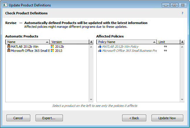 Whenever the Product Recognition Service automatically finds new or updated products, those products must be imported to your KeyServer data before you can make use of them, which may require changes in both products themselves and in the underlying program variants. As long as the changes have no effect on policies they are generally completed silently. But any time Applications are changed within a product that has policies, you will be warned of the changes before they are applied, and can examine them in this wizard.