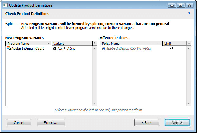 On this screen, existing variants are too general, and must be split into more specific variants. In the screenshot above, Adobe InDesign is currently configured to use 7.x as the variant mask. When CS5 was released this seemed like the correct configuration. However, when CS5.5 was released, the version for InDesign was 7.5 where it had been 7.0 for CS5. So at this point we had to change product definitions to distinguish one more decimal. The various CS5.5 products had to have a 7.5.x variant that was distinct from 7.0.x. So this particular change could actually appear during normal operation.