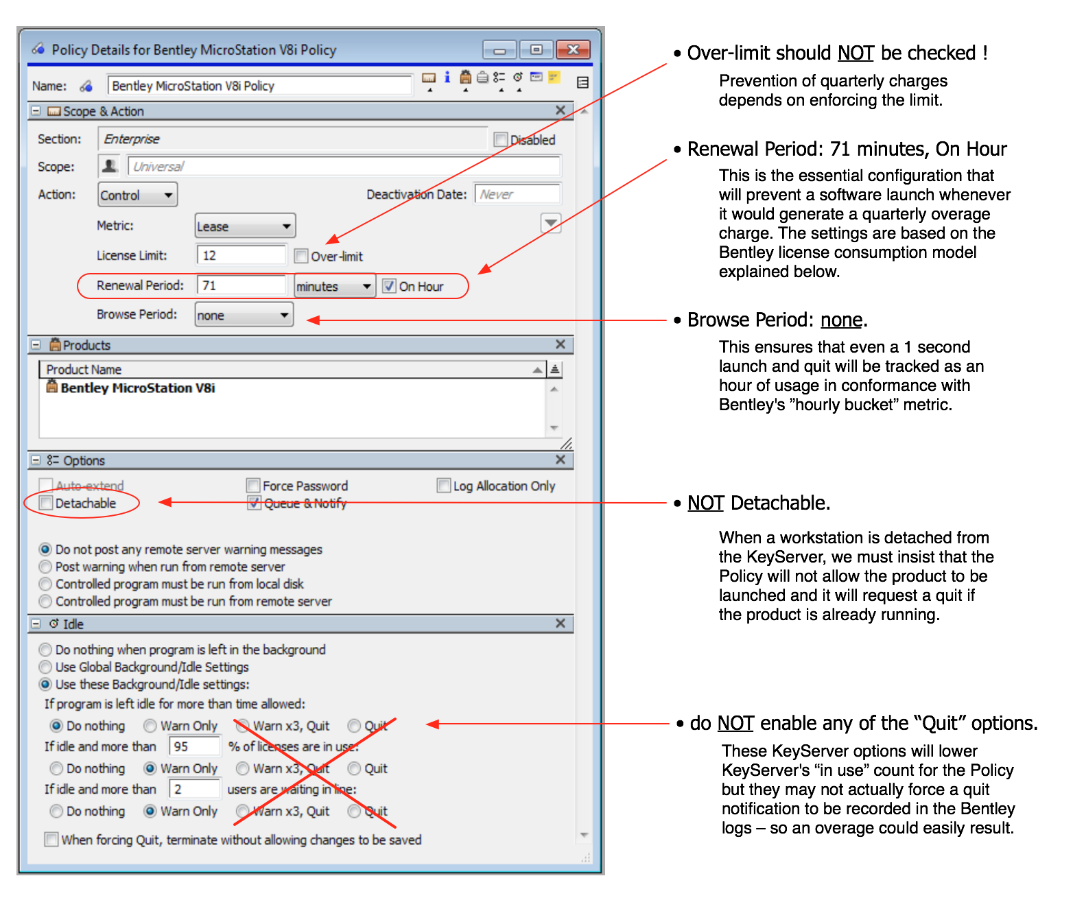 * In fact, as of September 2015, Bentley's latest CONNECT edition product releases include a new licensetool.exe component that changes the padding on license return times from 10 minutes to 1 minute. If you are managing one of these new product versions you can use a Policy "renewal period" of 62 minutes instead of the 71 minutes recommended above (for the older versions). Prior to September, a few Bentley products had already adopted this new metric so in such cases, the shorter lease time setting can be used to limit usage more efficiently while still preventing overages.