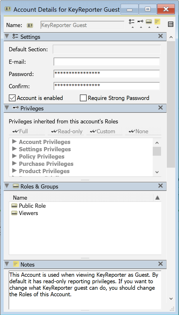 Accounts allow authenticated uses to log in and have Permissions based on the Roles and/or Groups they contain. These are managed in the Admin Access window of KeyConfigure.