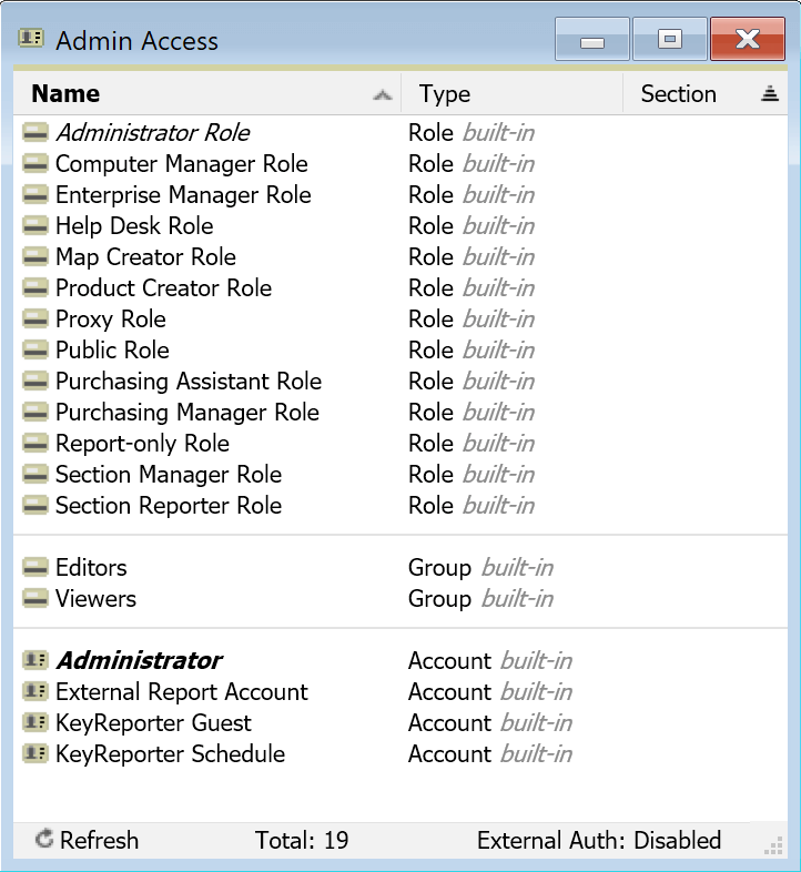 By default, KeyServer has several built-in Accounts defined, some of which are of particular interest: Administrator, Manager, External Report Account, KeyReporter Guest, KeyReporter Schedule, and Community.