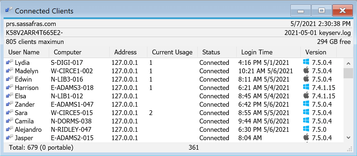 The main part of the Connected Clients Window contains a list of clients who are currently connected to the KeyServer. The list has five column headers. It can be sorted by any of these columns, but the sort will only be temporary (unlike in other windows). That is, once any of the information in the window changes, the sort is not necessarily correct any more, so you may need to re-sort.