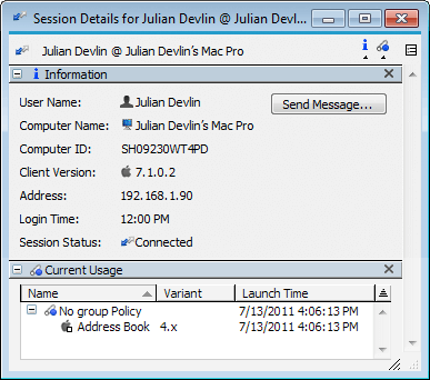 This pane shows much of the same information which is displayed in the Connected Clients Window, and additionally, the Computer ID, Login Time, and Session Status.