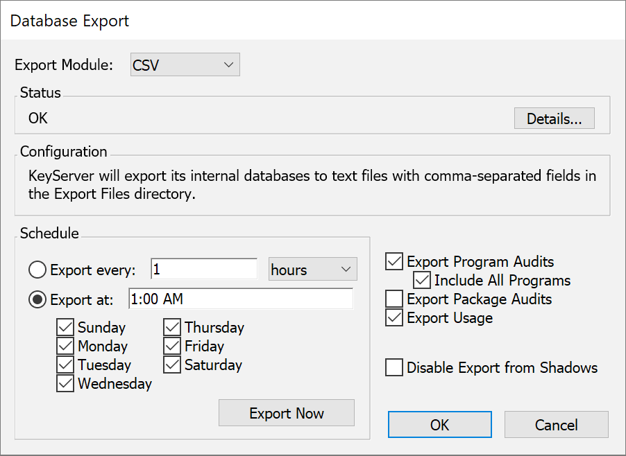 This module exports all databases in comma separated field format into the “Export Files” directory (within the "KeyServer Data Folder"). Unlike the ODBC or MySQL methods, the exported data is not immediately accessible to reporting tools until it has been explicitly imported into some database or analysis tool. As noted above, exporting is not incremental and can be scheduled at most once per day.