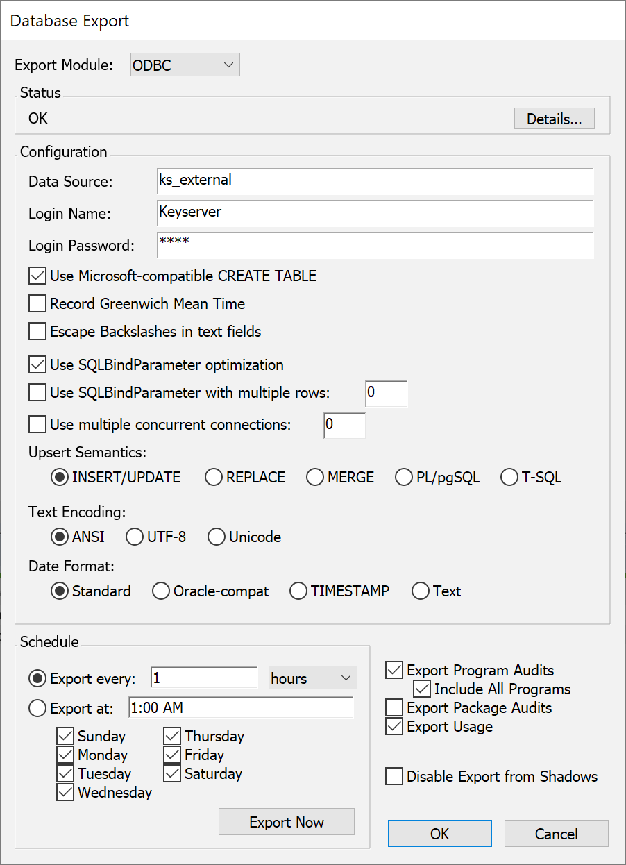 Note: every time one of the static export methods (XML/ CSV/ Text) is run, the complete database files are exported into the "Export" folder within the KeyServer Data Folder replacing any previously exported file of the same name. For these three static methods, scheduled exports are allowed at most once per day. Also, since a complete export of large databases can be slow, you might want to disable export of Audits and Usage when using a text based method. These methods do not use the network to pass data directly to a remote database server and cannot be performed incrementally (e.g. complete database files are exported every time). They can be used for static export/import of data from your TDX ITAM Server into another database or analysis tool. Usually, exporting to a database of some sort is a better choice than exporting to any of the text formats.
