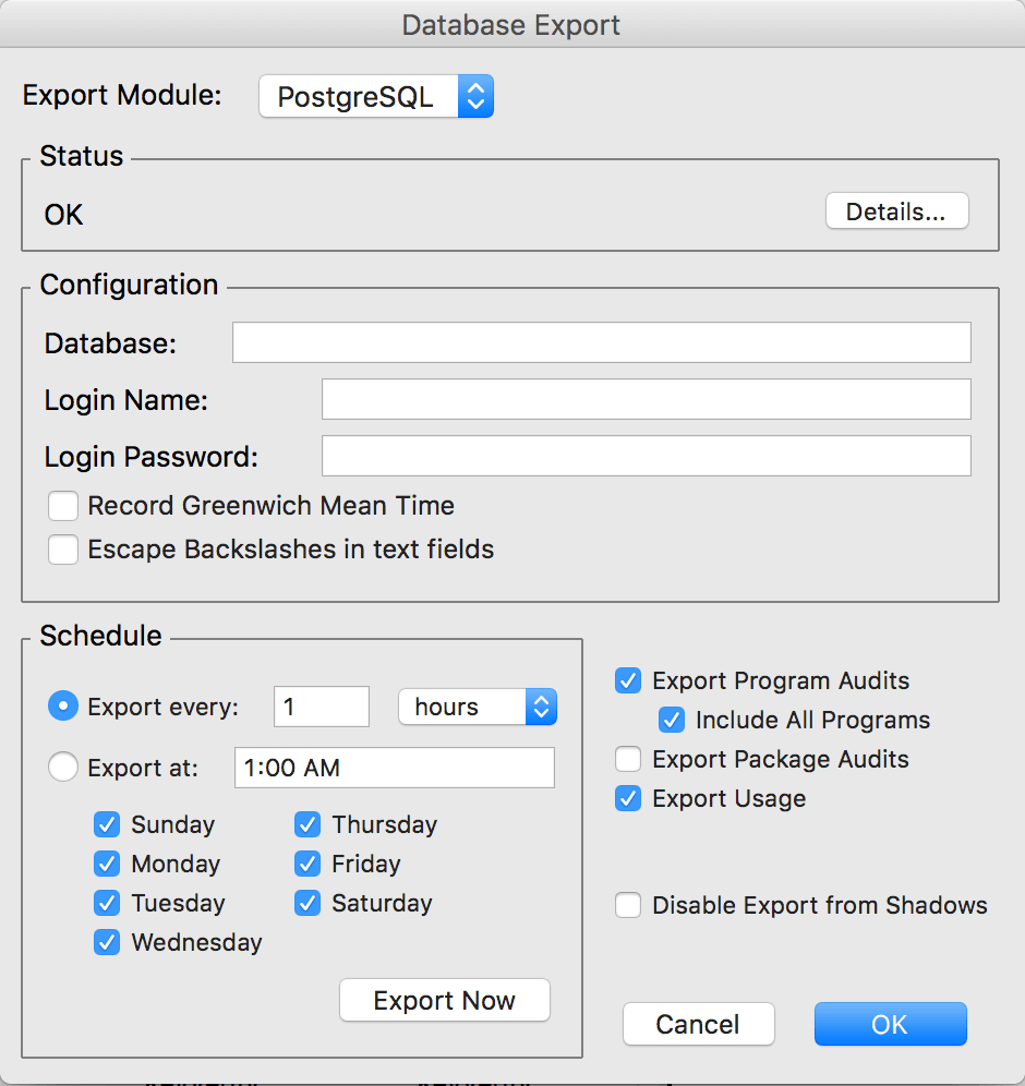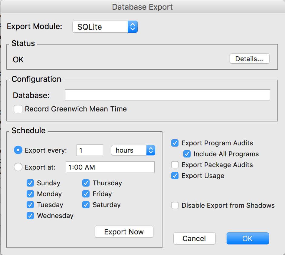 - Open the Database Export dialog and click Export Now