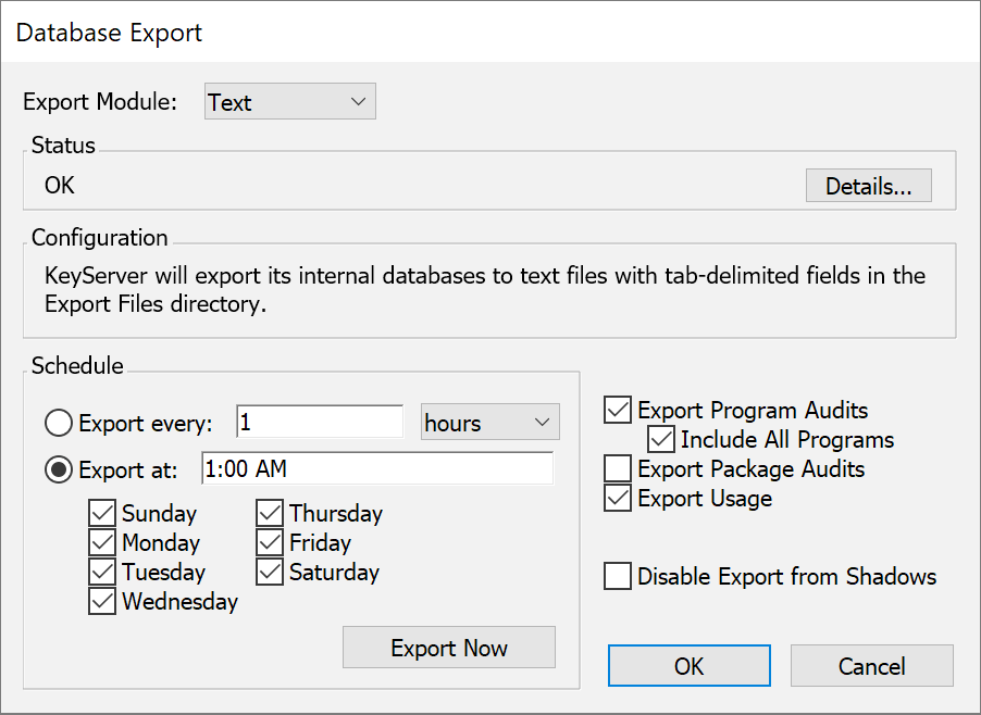 This module exports all databases in tab separated field format into the “Export Files” directory (within the "KeyServer Data Folder"). Unlike the ODBC or MySQL methods, the exported data is not immediately accessible to reporting tools until it has been explicitly imported into some database or analysis tool. As noted above, exporting is not incremental and can be scheduled at most once per day.