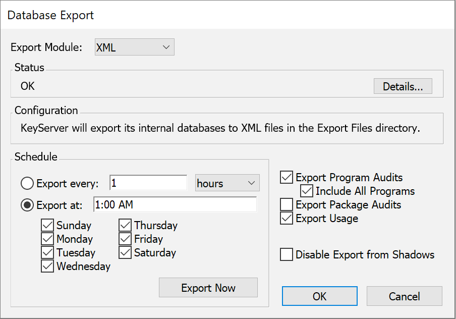 This module exports all databases as XML files into the “Export Files” directory (within the "KeyServer Data Folder"). Unlike the ODBC or MySQL methods, the exported data is not immediately accessible to reporting tools until it has been explicitly imported into some database or analysis tool. As noted above, exporting is not incremental and can be scheduled at most once per day.