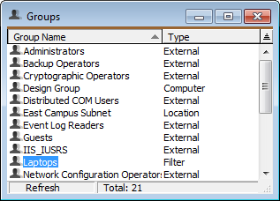 Group membership is determined by an OR of various conditions. When checking to see if a client is in the scope of a policy, each condition for the group is checked, and if any of them are met, group membership is satisfied, and the policy applies to the client. Group membership can be given either because the computer is in the node list for the group, it is in a Division which is associated with the group, it is in a Location which is associated with the group, it matches the Filter defined for the group, or the authentication module recognizes the computer or user as a member of the group. Currently, it is important to note that the Group Details Window does not show any indication of whether this group is a valid group according to the authentication module. It does, however, list Computers, Divisions, and Locations which are associated with the group, and the filter pane lets you bring up a window showing those computers which match the filter.