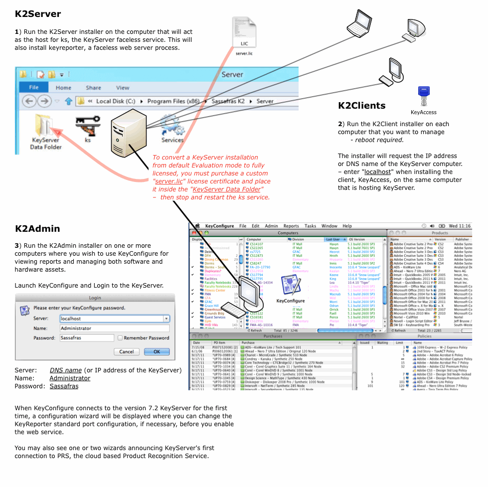 The Reconcile... task is designed to document and maintain the balance between the Purchase of software entitlements and management Policies. Additional windows and the corresponding details are used for more specialized tasks: KeyConfigure can be extended by JavaScript. Custom scripts can be authored by anyone proficient with JavaScript and familiar with the scripting environment documented here.