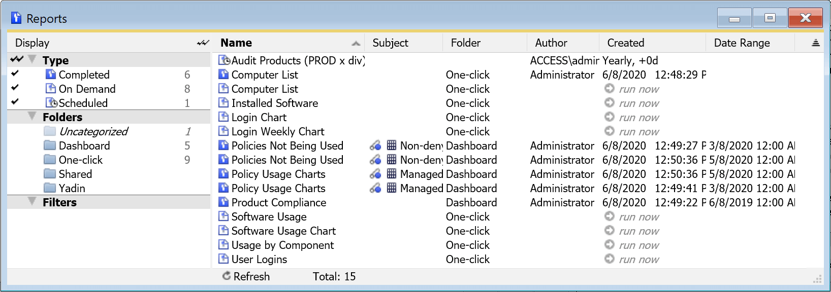 As with other windows, you can click to the far left column to enable or disable any navigation item to use it as a filter of what reports are shown on the right. While there is a section for Filters, the Type and Folder can also be used to filter the report list without making custom filters.