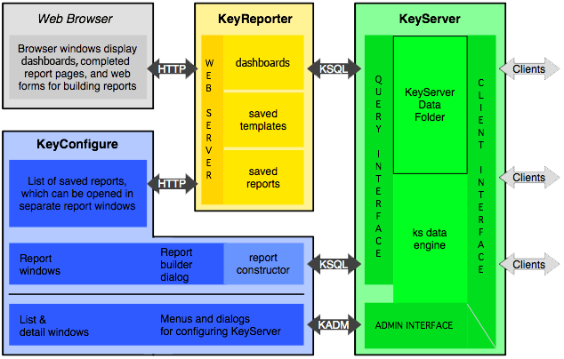 The KeyReporter process interacts with the KeyServer process (and its databases) in much the same way as KeyConfigure. But unlike KeyConfigure, the KeyReporter process itself has no user interface - instead, a web browser is used as the front end for defining report templates, specifying scheduled run times, running reports, and accessing the archived results.