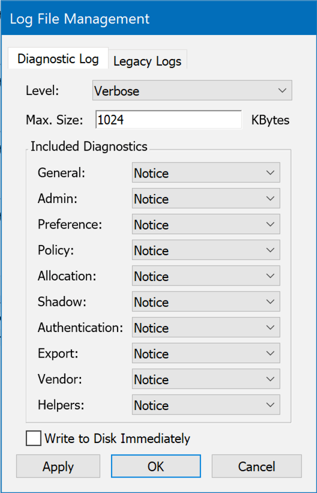 The diagnostic log can be useful to Sassafras Software Support but won't be very informative to the KeyServer Administrator. The options in this pane control how much data is written to the diagnostic log. The default values are Verbose, 1024, and Notice for all remaining drop-downs. Write to Disk Immediately is unchecked by default. You should not change any of these settings unless instructed by Sassafras Software Support. This log is saved as diagnostic.log in the KeyServer Data Folder.