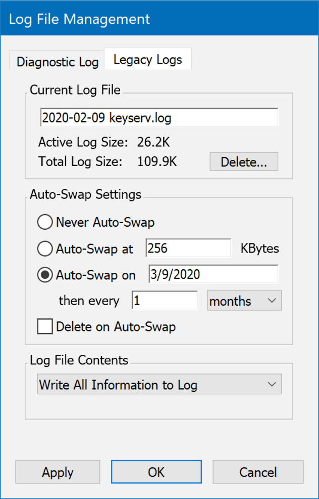 The Auto-Swap at nnn Kbytes option keeps the size of your log files reasonable. When used with the Delete on Auto-Swap option, the KeyServer limits the amount of space used for its log files. This may be especially important when the KeyServer is running on the same computer as a file server.