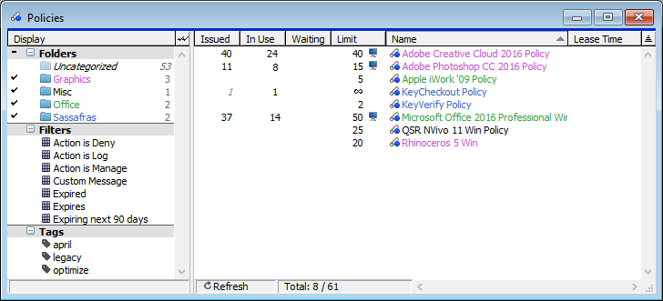 In short, a policy can be thought of as a particular set of access and usage rules being applied to one or more items in the Products Window. When a user attempts to run a program which is part of a product, each policy which is associated with the product is used to determine whether the program launch will succeed.