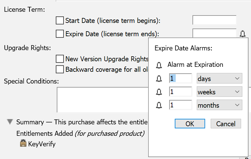 Note the bell icon next to the License Term: Expire Date field. Clicking this shows a popup where you can set 3 levels of Alerts which set when the alarm is logged in the Admin Alerts window. These display at login to KeyConfigure and show in the status emails if those have been configured. By default at the system level these alerts are 1 day, 1 week, 1 month, but any given purchase can be modified to a different reminder schedule. The reminder emails can be sent to a specific address per purchase using the email field in the External pane below.