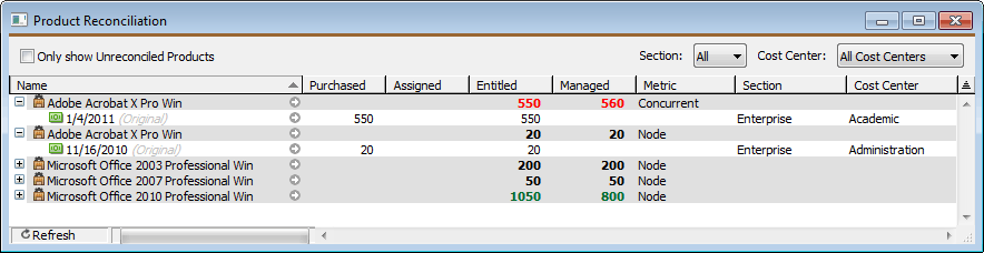 By default, every referenced product is included in the Reconcile window – that is to say, every product that is referenced either in a policy or purchase. Note also that when a purchase includes 'New Version Upgrade Rights', then the “effective product” that is currently entitled may no longer match the "nominal product" that was recorded at the time of purchase. Such a purchase will be grouped under the heading for the effective product in the Reconcile window since this is the entitlement count it contributes to. Note: for purchases that don't include an upgrade right, the "effective" product never changes – its always the same as the "nominal" product.