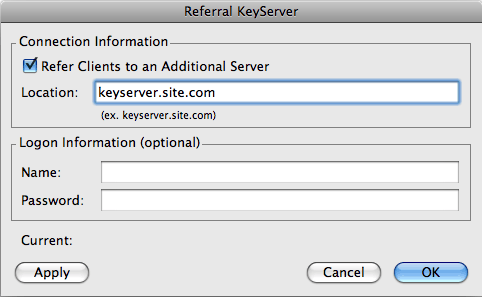 By default, referrals are turned off. Check the Refer Clients to an Additional Server box and in the Location field, enter the network name or address of the KeyServer to which you will refer clients. Enter a name and password if the enterprise KeyServer requires this information.