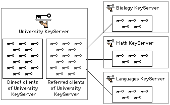 In the examples above, if there were ten departmental KeyServers, all ten could refer to the central KeyServer. Each departmental user would simultaneously have access to their local departmental KeyServer and to the enterprise KeyServer, but would not have access to the software managed by the KeyServers in the other nine departments. Also, any clients logged directly onto the enterprise KeyServer would only have access to that KeyServer's policies, as the enterprise KeyServer is not referring clients to any other KeyServer.