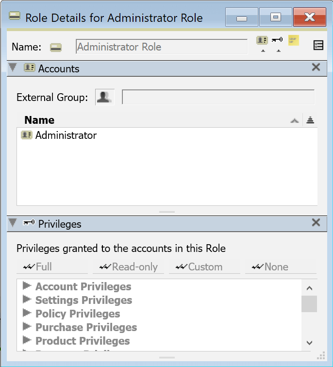 This pane allows you to view and possibly edit Privileges for a Role. You can not modify these settings for built-in roles and they will show as grayed out. You can use a built in role as a starting point for modifications by right clicking on a Role and choosing Duplicate. The special Administrator Role always has all privileges. The buttons across the top offer quick ways to bulk set all privileges in the Role. To see all items under each section of privileges, right click in this box and Expand All. You can then easily see the results of clicking the buttons at the top.