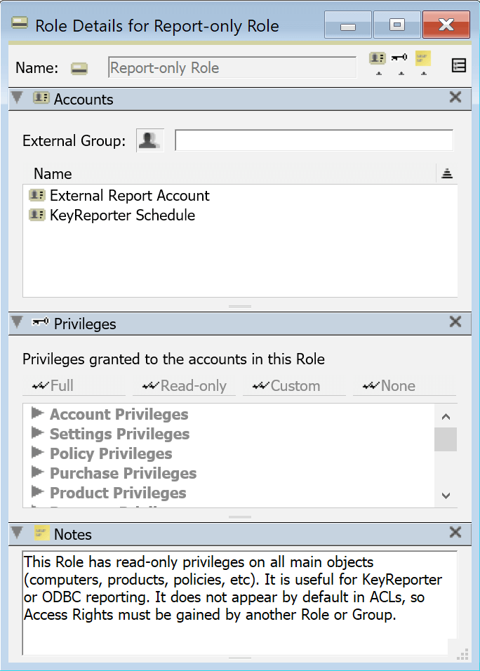 Roles are the mechanism for controlling Privileges, which form half of Permissions management along with ACLs. Roles are managed in the Admin Access window of KeyConfigure. Assigning a Role to an Account grants privilege to that authenticated user.