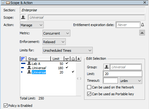 The additional options for a Concurrent Policy revealed by the triangle button in the Scope & Action pane pane of a Policy Details Window let you split license allocation among several "Pools" (Groups of Users or Computers) each with a License Limit and Scope specified. For example, you might want to assign a certain number of licenses for exclusive use within a particular computer lab. If use in the lab is only needed at specific times on certain days, you can schedule this exclusive lab restriction so that it applies only to the scheduled time while leaving a different allocation for all Unscheduled Times.