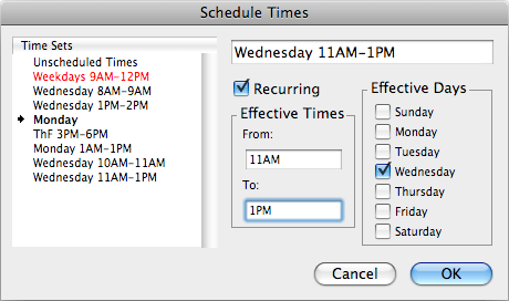 For example, based on a defined Group of lab computers, you could restrict some Photoshop licenses to a pool for exclusive use in the lab from 2:30 to 3:30 on Wednesday afternoons. For other Unscheduled Times, all licenses would be available for use anywhere.