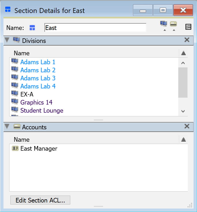 If you double click a Section you'll open its details window. This will show the name, Divisions it contains, and any Accounts that have this section in their Default Section setting.