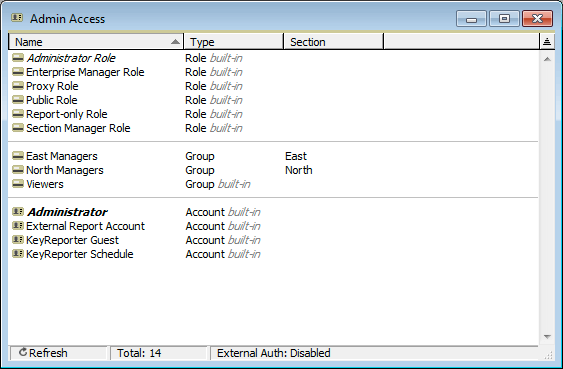 Having created Divisions and Sections, we are now ready to create Section managers. Switching to the Admin Access Window, we see various built-in Roles and Accounts. In the Groups list, there is a single built-in group named “Viewers”, but two additional Groups have been created, one for each Section. These groups will help to ensure appropriate Access Rights for Section level Administrators, but for now we don't need to manipulate them directly.