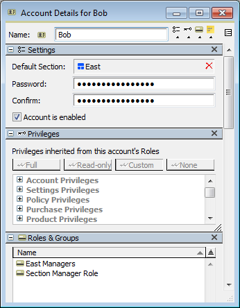 Next, drag the “East” Section from the Computers window into the “Default Section” field in the Account Details. Now Save the window without closing it. Notice that after saving, the Roles & Groups list also shows the “East Managers” group, even though we did not explicitly drag it in. It has been added automatically since we assigned Bob to the East Section.