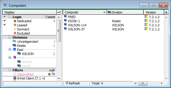 Right away, you will see that the entire North section is dimmed. We can see that it exists, and we can see the Division names, but we cannot see any computers within that division. On the other hand, we can still see computers in the Uncategorized division, as well as the Kiosks division. Both of these divisions have not been assigned to a Section. If we open some computer details though, we will notice that we can change computers in our own Section - for example adding notes or changing the Login type. But for computers outside of our Section, we have read-only access.