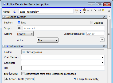 Notice in the “Scope & Action” that our Section, East, has automatically been filled in. Furthermore, while we can edit the Policy name, Metric, etc, the Section is the one thing we cannot change. Because there is a Section, this Policy will only apply to that Section. The important thing is that as a Section specific Administrator, we can only make a Policy that will apply to our Section. We cannot (accidentally or otherwise) apply a Policy to parts of the Enterprise.