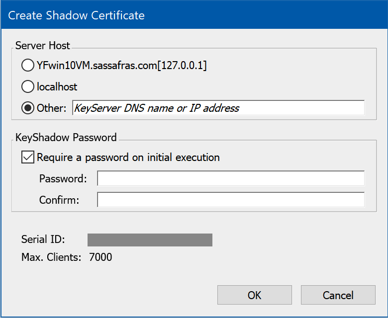 In order to prevent duplicated copies of the KeyShadow software from running on unauthorized computers, the shadow installation can be protected by a "shadow password" which must be entered when the KeyShadow process is launched for the first time on a new host computer (as explained in the KeyShadow installation instructions). You have the option of specifying this password or creating a certificate that does not require a password. Once a shadow has successfully connected to the KeyServer, it will appear in the Shadows window where its status is shown.
