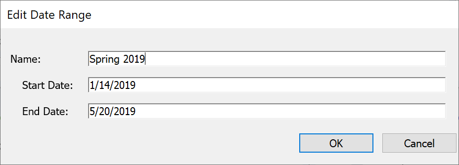 The Date Range Window very simply gives a name and range of dates. Just type in the date string for your start and end dates and you'll be able to use this date range not only for attaching to Time Periods, but also as a preset that is available in any Report.