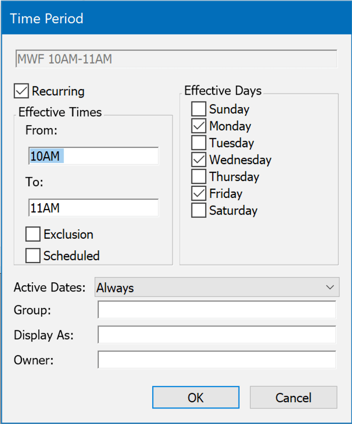Each Time Period is a range of hours and a list of days. There is also a checkbox labeled Recurring that determines whether a Time Period is the same regardless of the week, or whether it only applies to certain days. Usually, a Recurring Time Period will be the most useful, since reports can already be given a specific date range, and you can also define custom Date Ranges both for reporting and to specify over what dates a recurring Time Period occurs. Note you must define Date Ranges before they show in the Active Dates drop down.