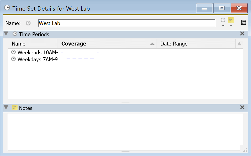 The Time Set Details Window shows the name of the Time Set, and has two panes - Time Periods and Notes.