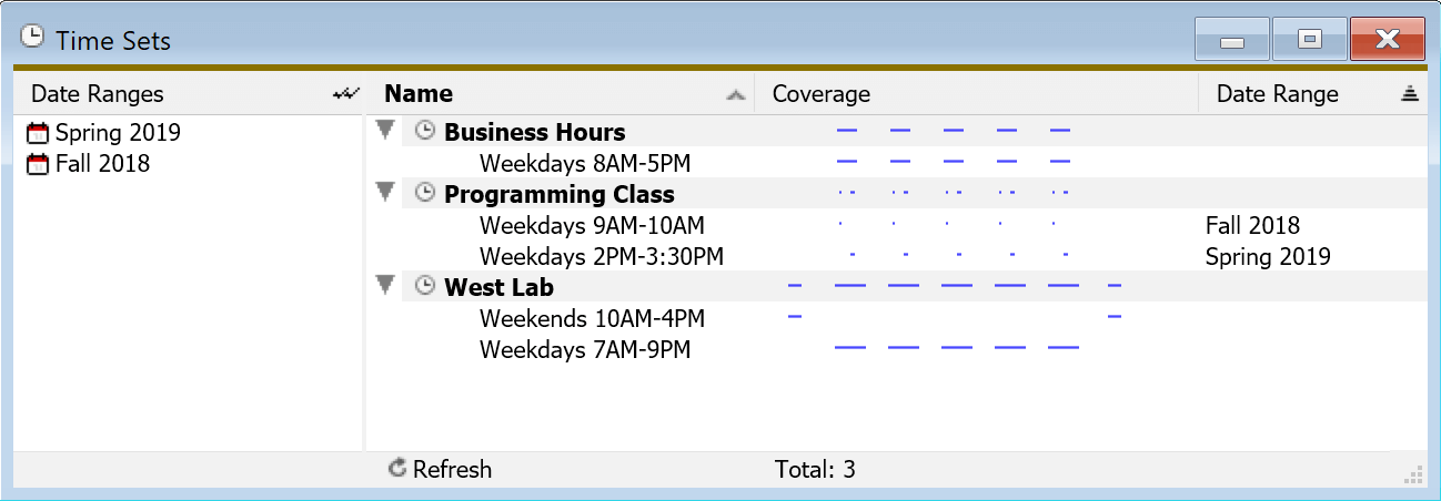 Once you have created a Time Set, you must add one or more Time Periods in the Time Set Details window in order for it to be useful. Double click a Time Set (name in bold) to open the Time Set Details window to define these. Once made, you can see the coverage column shows a graphic representation of the hours on days those periods cover. By showing the Date Range column, you'll also see any applicable ranges applied to the periods.